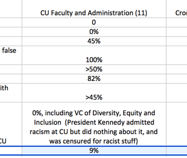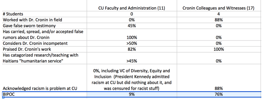 Prof. Cronin responded “what is it about the testimony, evidence, and credibility of all witnesses that made the Panel you chaired find me professionally incompetent? The witnesses who supported my case included my students, people who had worked with me directly, gave truthful testimony, and had never devalued my work in Haiti as "humanitarian service." The witnesses who supported CU's case did not include students, had not worked with me directly, lied under oath, and had devalued my research and teaching in Haiti as "humanitarian service". What is it about the latter group of witnesses that caused you to value their credibility and give them more weight?!?!? Conversely, why would you not give high weight and credibility to honest witnesses with direct knowledge to my research and teaching. The only rows in the table that could possibly account for the Panel you chaired to give more weight to CU witnesses is that 0% acknowledged racism as a problem and 91% of them were White. Anybody should be able to see the racism that was displayed and supported by the P&T Panel. If there is an explanation besides racism that explains why truthful BIPOC testimony by people who worked with me directly was considered less credible and less weighty that untruthful White testimony from people who had not worked with me directly, please share it with me now with supporting evidence.”