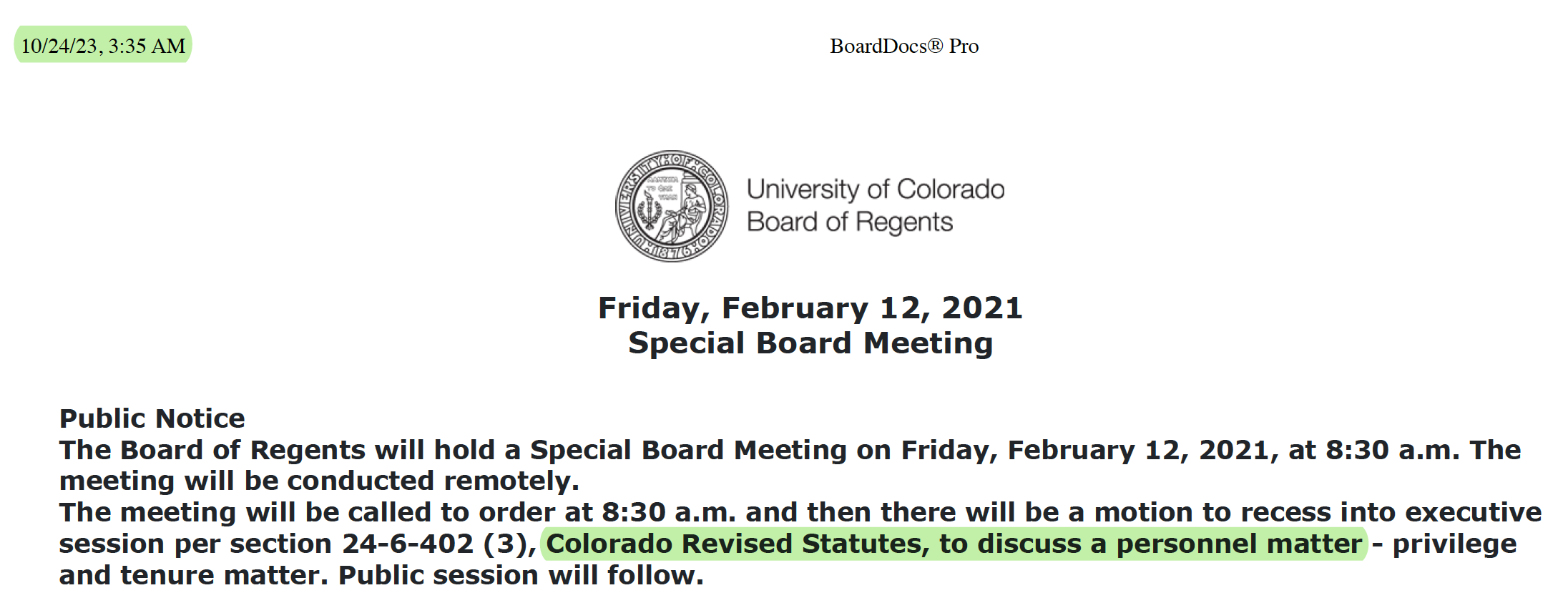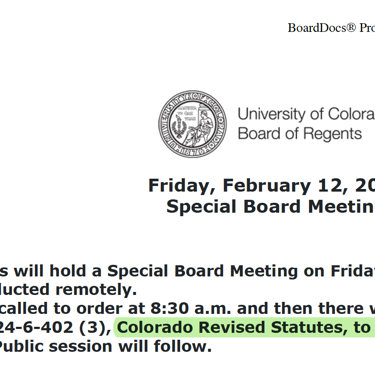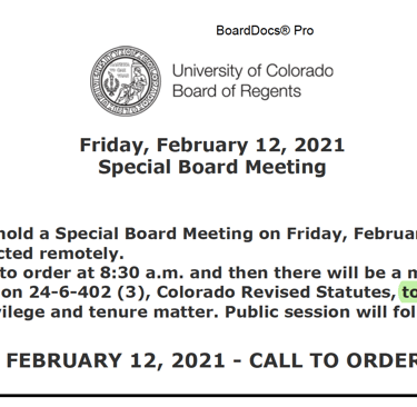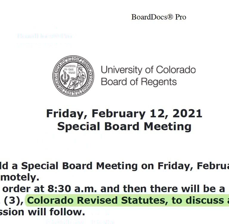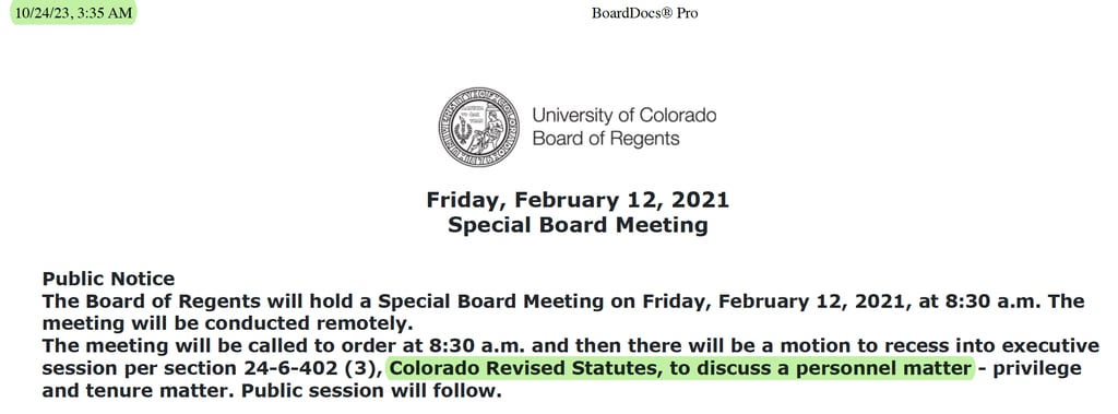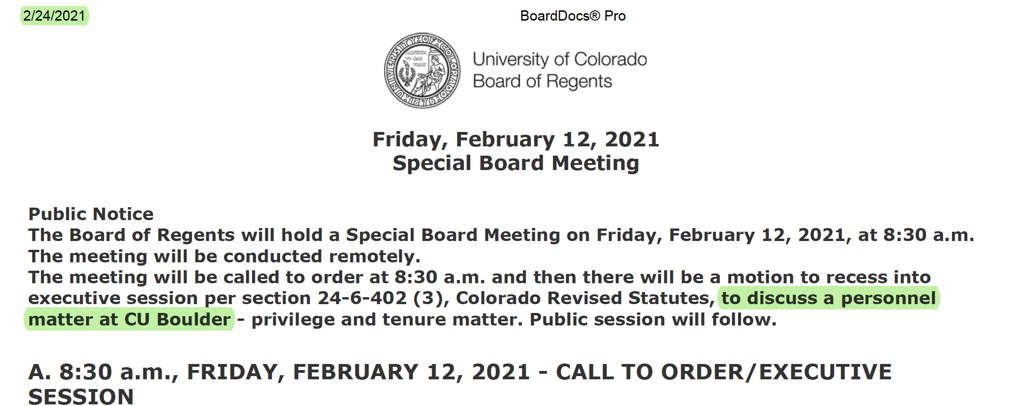 The public notice above was copied from the CU Regents' webpage on 2/24/2021. Notice that the Regents were "to discuss a personnel matter at CU Boulder".