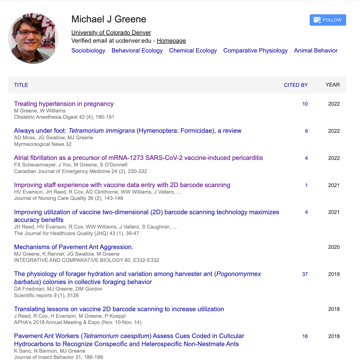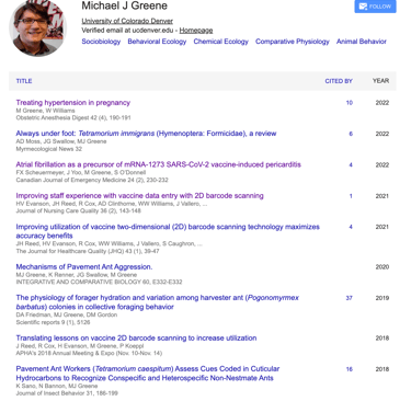 Prof. Greene was promoted to full professor of Human Physiology even though he has never authored a research paper about human physiology after being hired by CU. However, some of the papers attributed to Chair Greene on Google Scholar are related to human physiology (e.g., hypertension in pregnancy and atrial fibrillation), but were not authored by him. Research integrity dictates that authors only take credit for work that they have performed. Having half of ones publications improperly attributed to them, especially during a period in which they are undergoing review for promotion in a field they have not published in, is sloppy or unethical.
